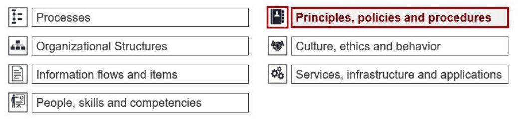 A principle is a clear expression of the core values of the enterprise. Principles should be limited in number and expressed in simple language. Principles influence policies and are driven by culture, legislation and regulations, standards, and most importantly, the enterprise values and vision.
