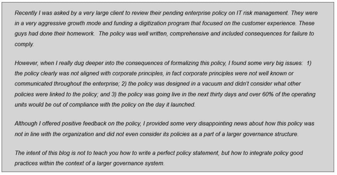 In today’s high velocity business environment, it’s easy to lose sight of some basic governing principles that might be viewed as cumbersome and restrictive. Be careful, because governance principles exist to ensure the proper balance of performance and conformance when achieving business objectives. If your organization ignores your essential internal controls, it can introduce vulnerabilities that were never intended. Those vulnerabilities can then expose you to risk scenarios that could thwart your achievement of business goals. One of the key components of your governance system is policies, and this blog post is a result of my thoughts and experience in this area.