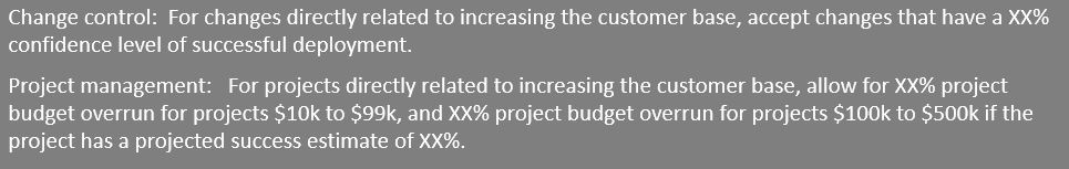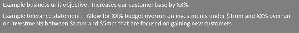 When determining tolerance, the business unit considers the overall enterprise appetite and how it applies to the relevance of each objective where the highest ranked objectives may have lower risk tolerance levels. As discussed earlier, tolerance is the acceptable level of deviation for any particular risk. At this altitude, resources become a major consideration as well, where you may assign more resources to areas with lower tolerance levels. Below is an example of a tactical level (business unit) tolerance statement based on the organization’s appetite.