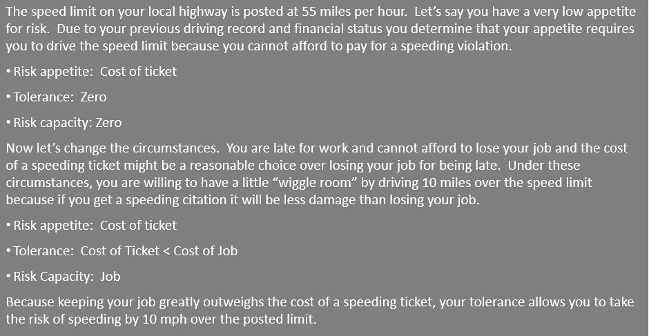 Oftentimes, risk appetite is used interchangeably with risk tolerance and risk capacity. Although they are related it is important to understand the key differences. Tolerance differs from appetite in that it defines the acceptable level of deviation, or what I call the “wiggle room” under certain circumstances. Capacity, on the other hand, is the objective amount of loss that an enterprise can tolerate without risking its continued existence. It differs from risk appetite which is more high level.