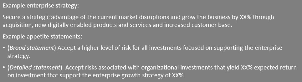 Each organization has their own objectives intended to create value for its stakeholders and should broadly understand the risk it is willing to undertake in doing so. Therefore, the risk appetite statement is an expression of the amount and type of risk that an enterprise is willing to accept in the pursuit of its business goals. Organizations should have a framework that provides an approach to the management, measurement, and control of risk.